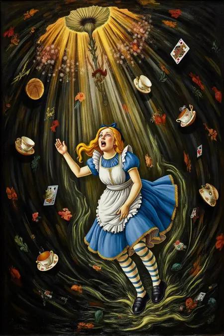 흐르는 머리카락, 섬세한 옷자락, 상징적인 꽃들은 고요하면서도 강력한 이미지를 만든다.