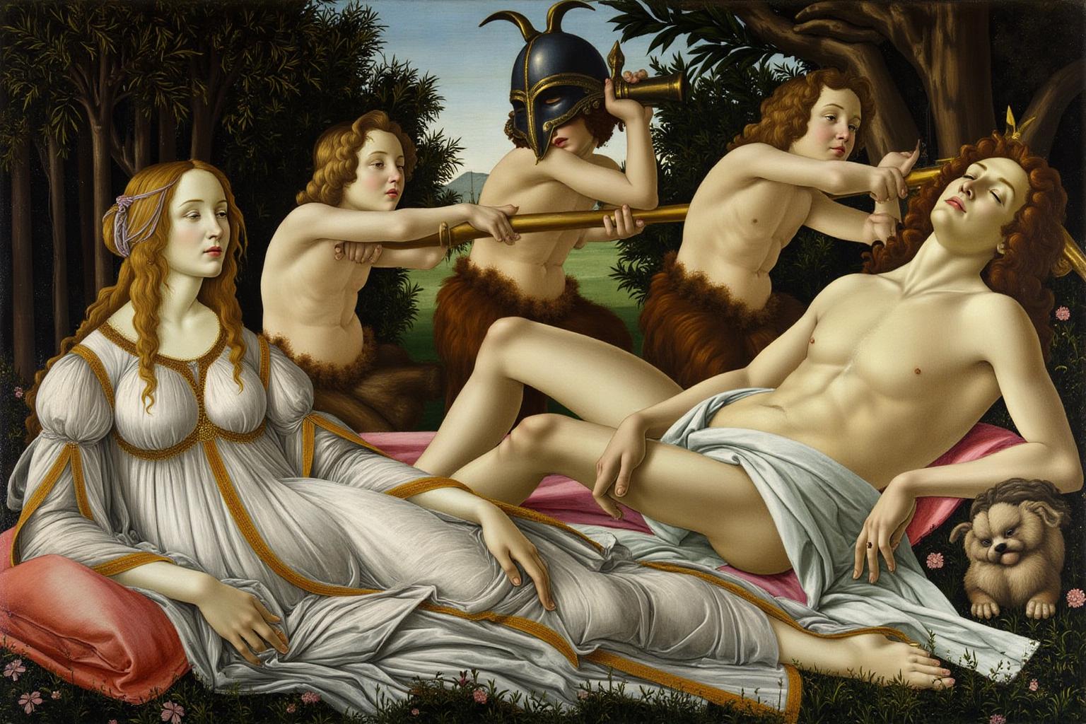 《비너스와 마르스》와 같은 보티첼리의 많은 신화적 작품들은 운명에 이끌린 사랑과 갈등을 묘사한다.