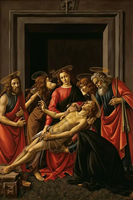 - 신화적 작품이 유명하지만, 보티첼리는 또한 깊이 있는 영적 종교화를 제작했고, 이는 강한 감정과 뚜렷한 인간의 표정으로 특징지어졌다.