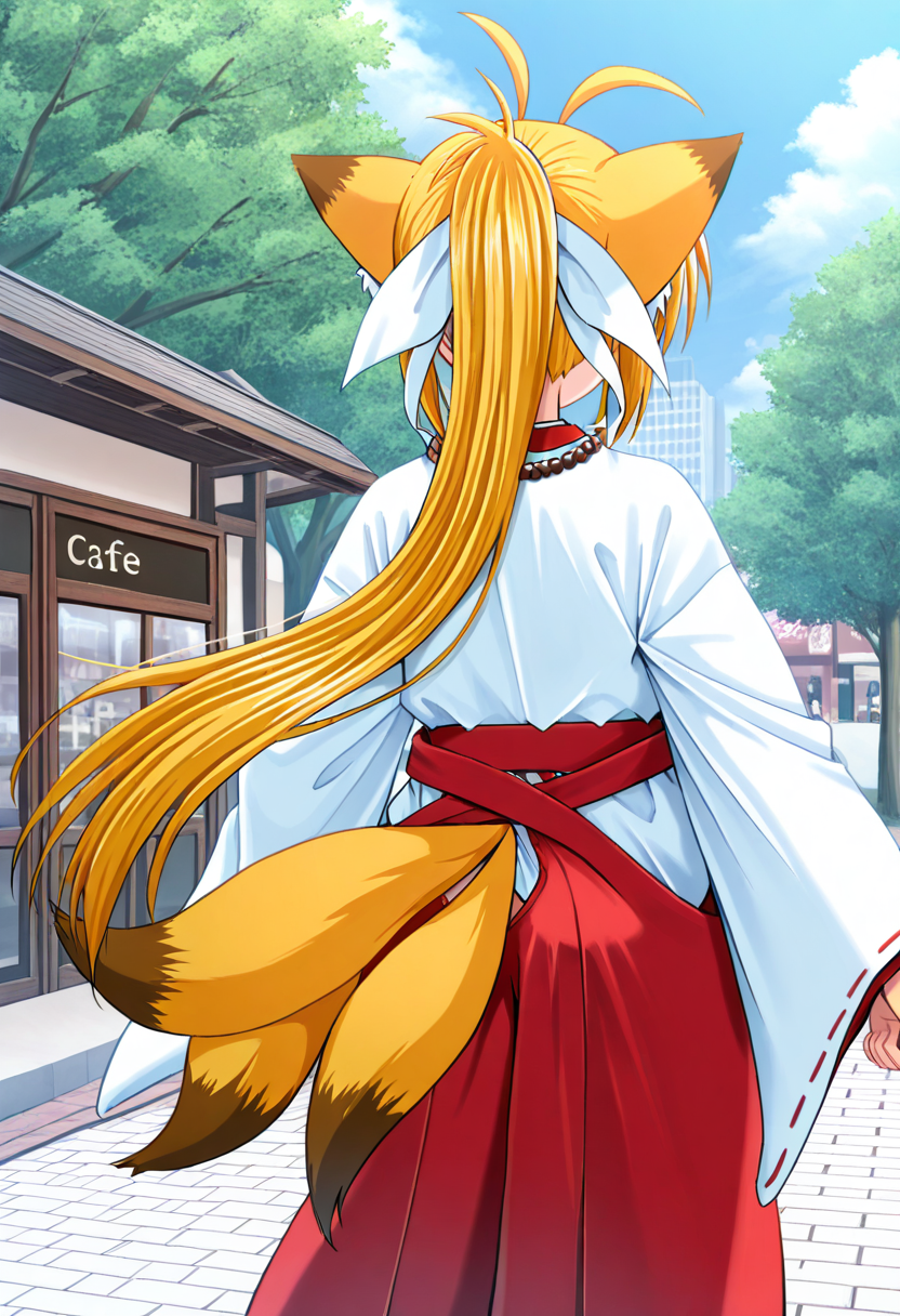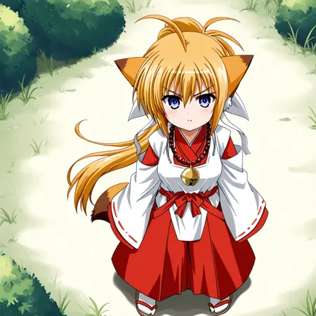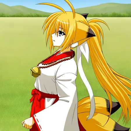 提示词:狐妖少女、kuon_(triangle_heart)、双色狐耳、双色狐尾、金发、长发、马尾、蓝眼、红色袴、凉鞋、神社巫女、和服、飘袖、多条尾巴、珠链、铃铛项链、白色发带,