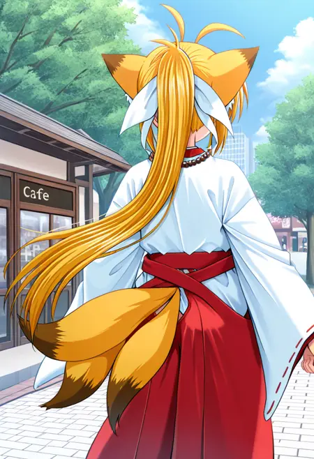 Prompts: fox girl, kuon_(triangle_heart), two-tone fox ears, two-tone fox tail, blonde hair, long hair, ponytail, blue eyes, red hakama, sandals, shrine maiden, japanese clothes, detached sleeves, multiple tails, bead necklace, bell necklace, white hair ribbon,