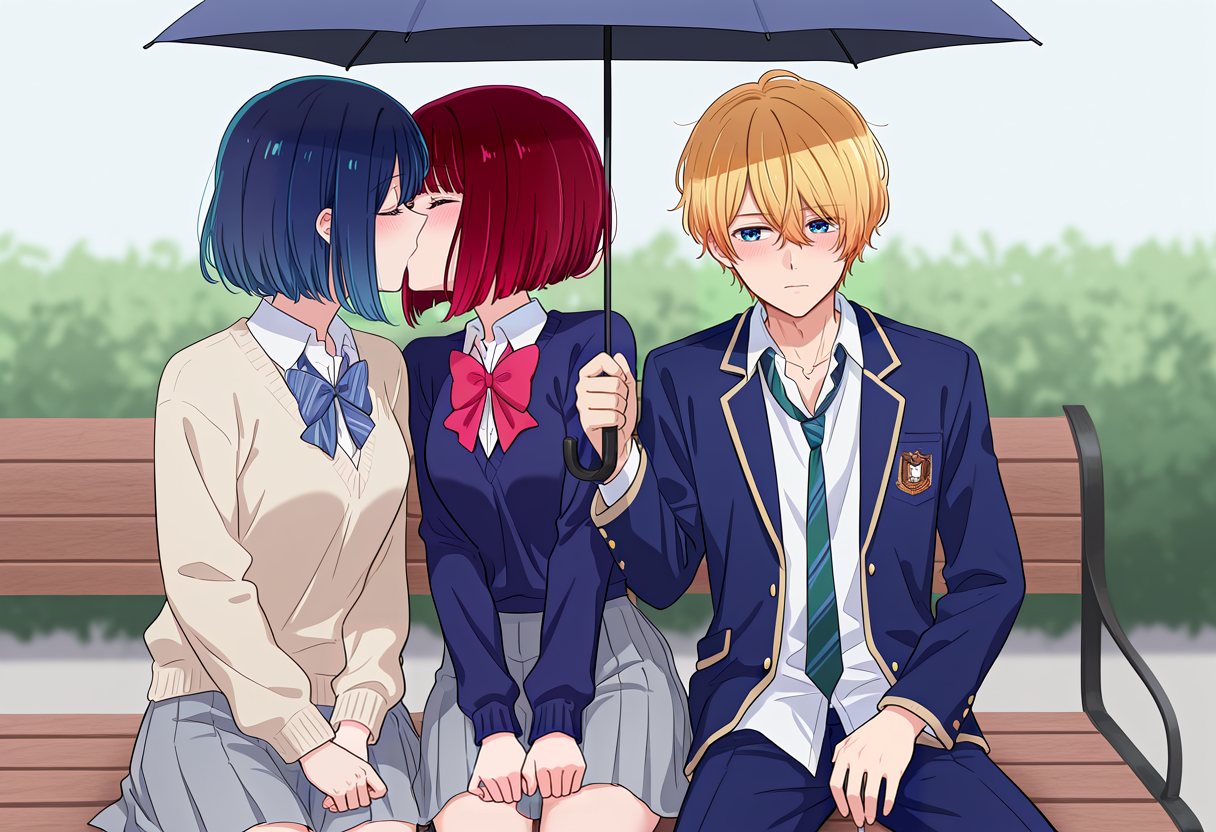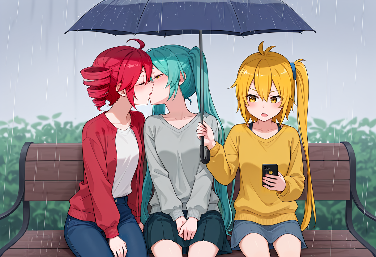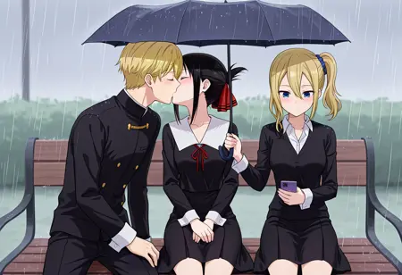 Trigger word: guy_holding_umbrella_over_kissing_couple_(meme), sitting, bench, rain, closed eyes, kiss, holding umbrella, shared umbrella, looking down,