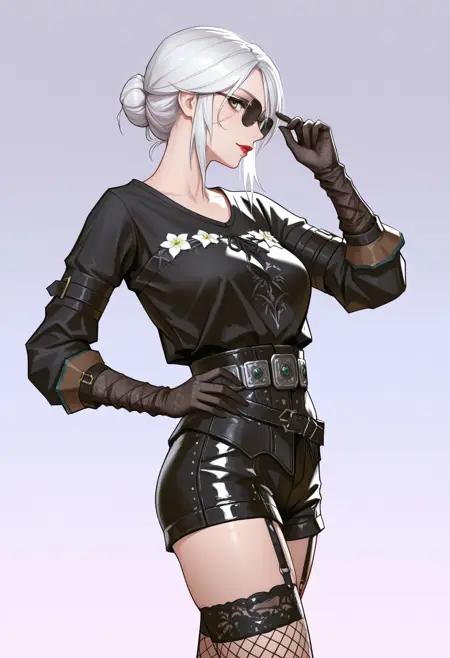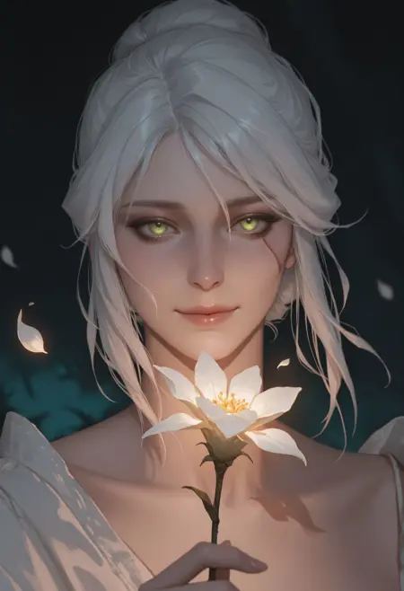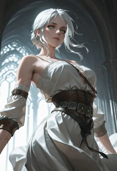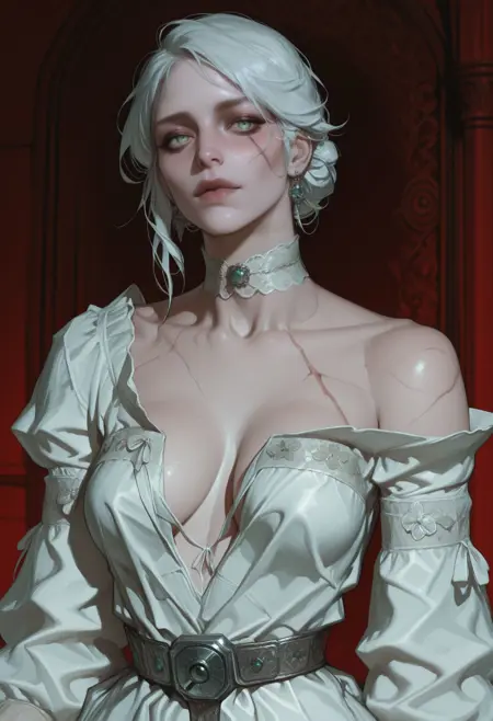 TW3C1r1, 1girl, White hair, hair bun, green eyes, scar on face