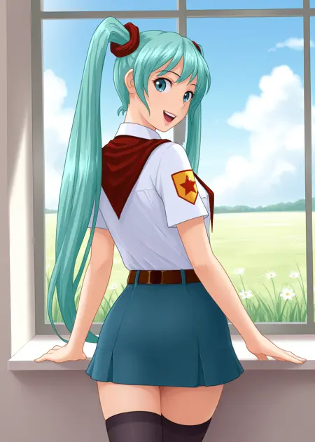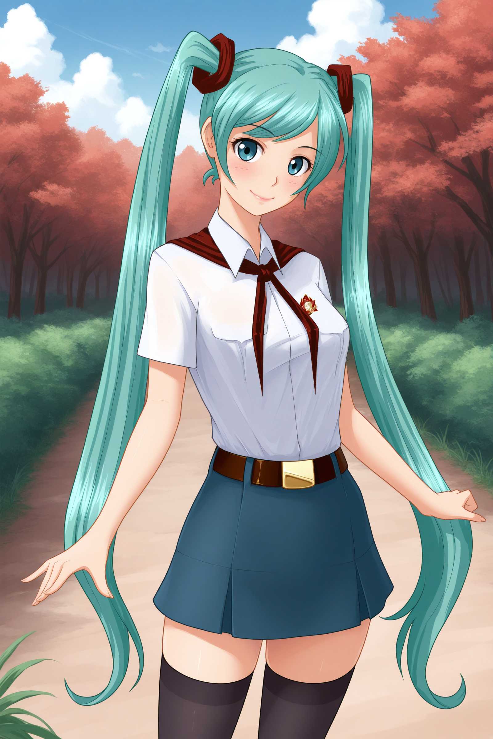 파이오니어 복장: mikugirlshirt, hair_scrunchie, red_scrunchie, pioneer_neckerchief, collared_shirt, short_sleeves, breast_badge, brown_belt, brass_buckle, blue_skirt, black_thighhighs