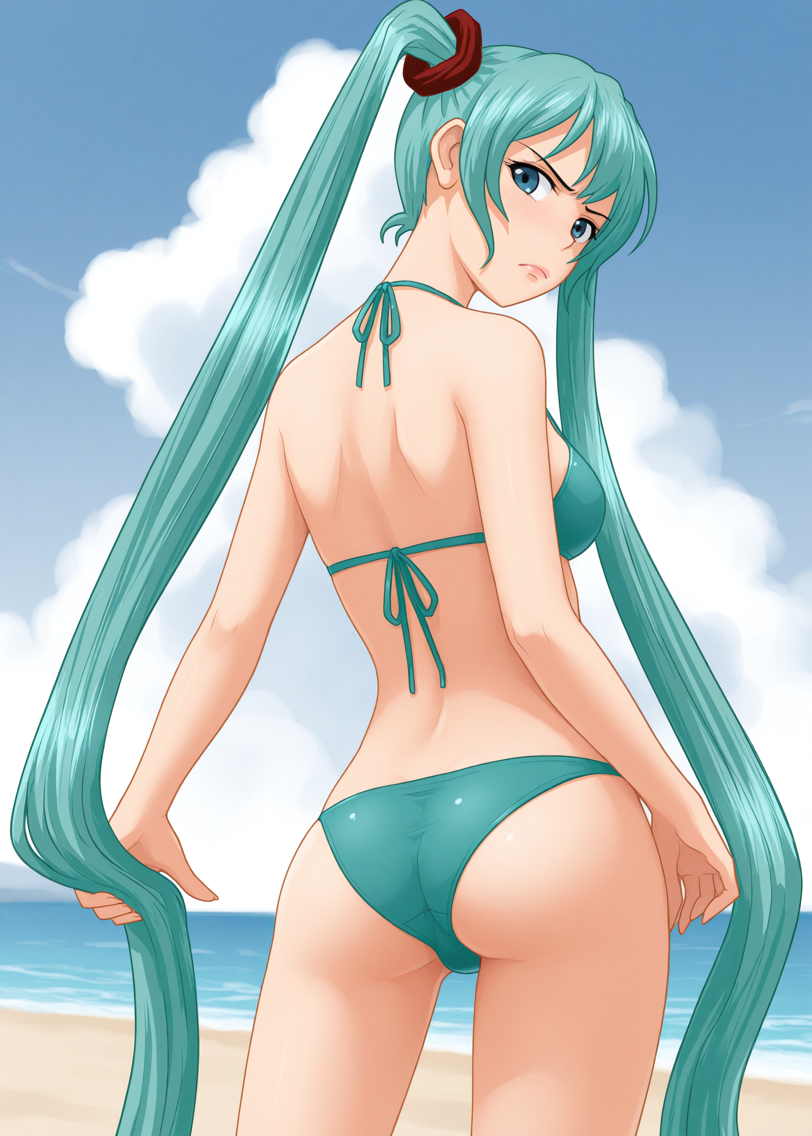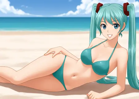 외형 태그: mikugirl, aqua_hair, very_long_hair, (twintails 또는 loose_hair_strand), blue_eyes