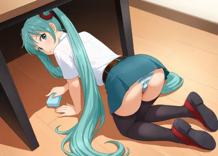 Appearance tags: mikugirl, aqua_hair, very_long_hair, ( twintails or loose_hair_strand ), blue_eyes