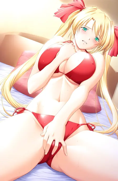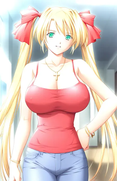 Akehime_Saki(Kyouhaku2), 1girl, solo, long hair, blonde hair, twintails, huge breasts, green eyes, hair ribbon, red ribbon,