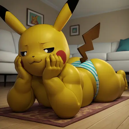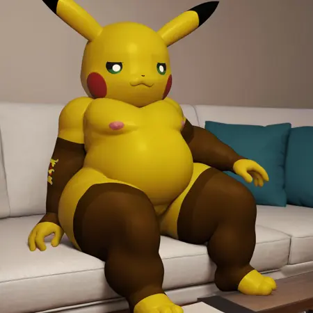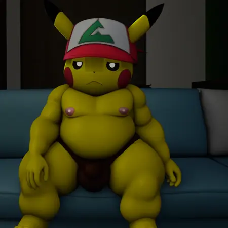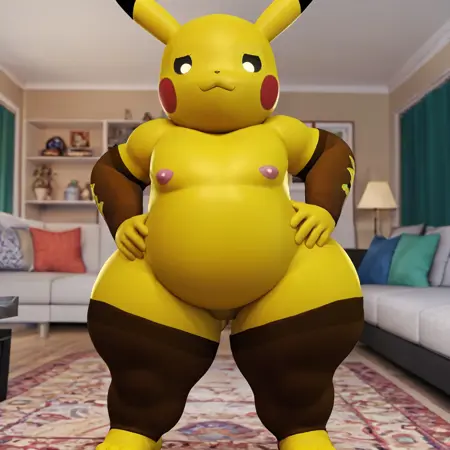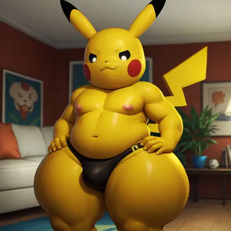 male, furry male, anthro, pikachu, pokemon (creature), yellow body, black eyes, black nose, red cheeks, pointy ears, tail, shortstack, chubby
