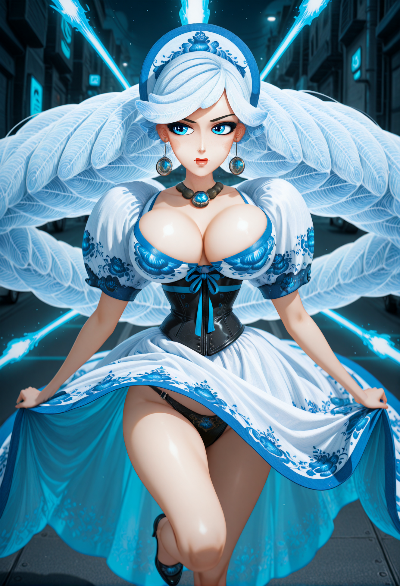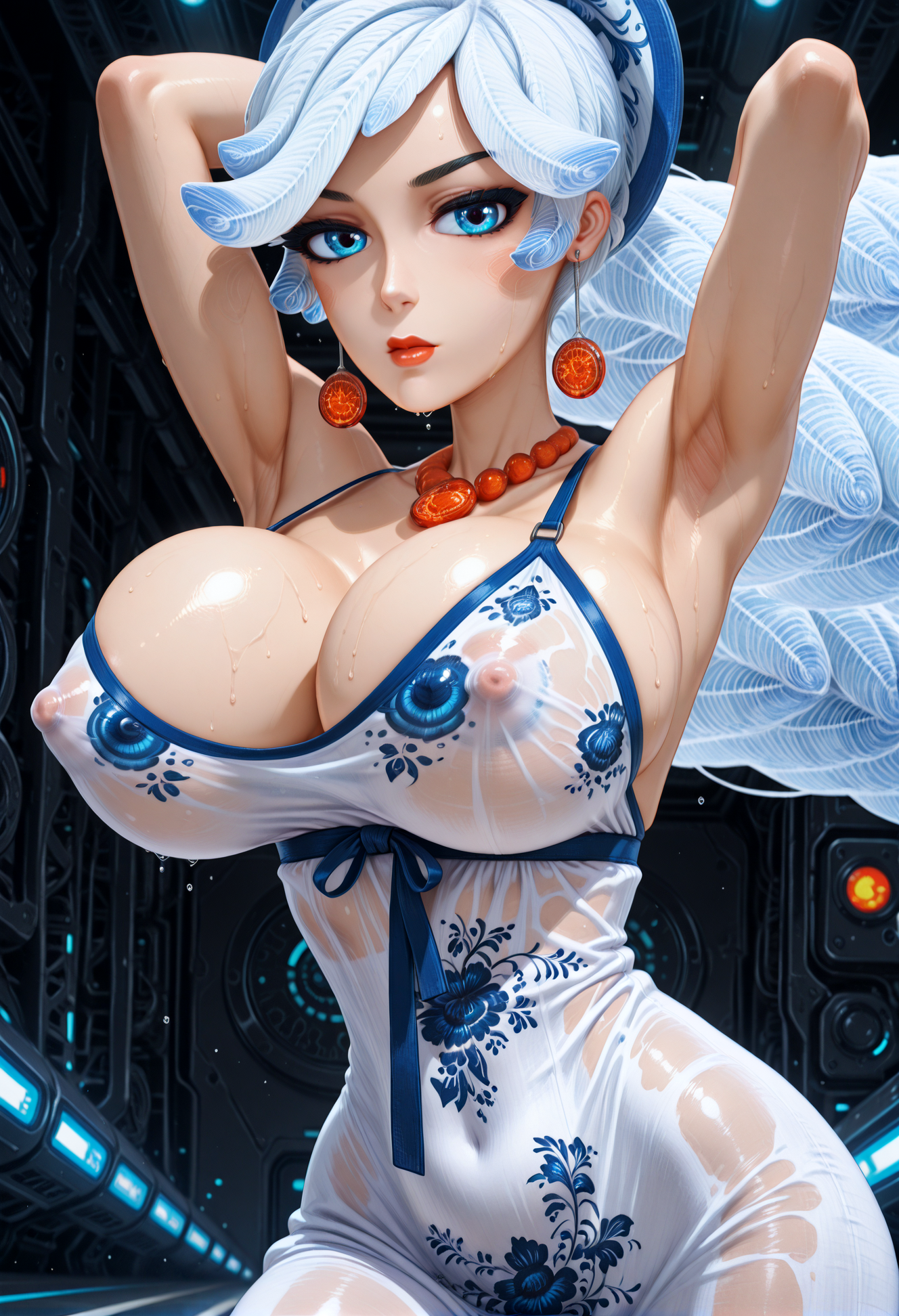 트리거 - crvna, 1girl, solo, 파란 눈, 흰 머리, 귀걸이, 가슴, 가슴 사이, 메이크업, 드레스, 뺨칠, 긴 머리, 큰 가슴, 헤어밴드, 립스틱