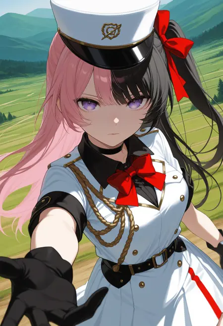 Hinan0Mltry, 보라색 눈, 다색 머리카락, 분홍색 머리카락, 검은색 머리카락, 긴 머리, 한쪽 올린 머리, 머리리본, 빨간 리본, 흰색 모자, 검은 목걸이, 흰색 유니폼, 빨간 넥타이, 짧은 소매, 검은 벨트, 흰색 치마, 검은 장갑