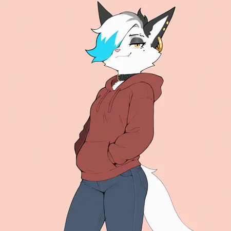 furry, hair over one eye, white fur, multicolored hair, tail, white hair, yellow eyes, eyeshadow, short hair, black hair, mole under eye, black fur, blue hair, ear piercing, ear ring, two-tone fur, eyebrow cut, gray hair, pink nose, tail, cat girl