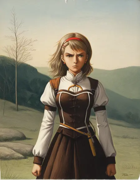 signature, artist name, artist logo를 추가하세요.20세기 초 독일 시골 분위기를 줄이고 싶다면 옷과 머리카락을 구체적으로 묘사하세요.