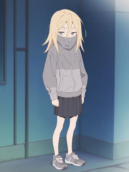 制服+ジャケット、ジッパー上げ:pleat skirt,grey jacket, covered mouth,zipper pull tab,grey sneakers,