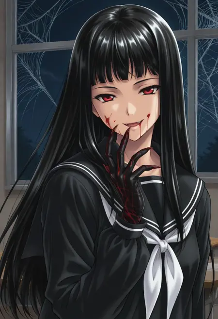 Hair style etc.(if necessary): black hair, long hair, red eyes, hime cut, blunt bangs
