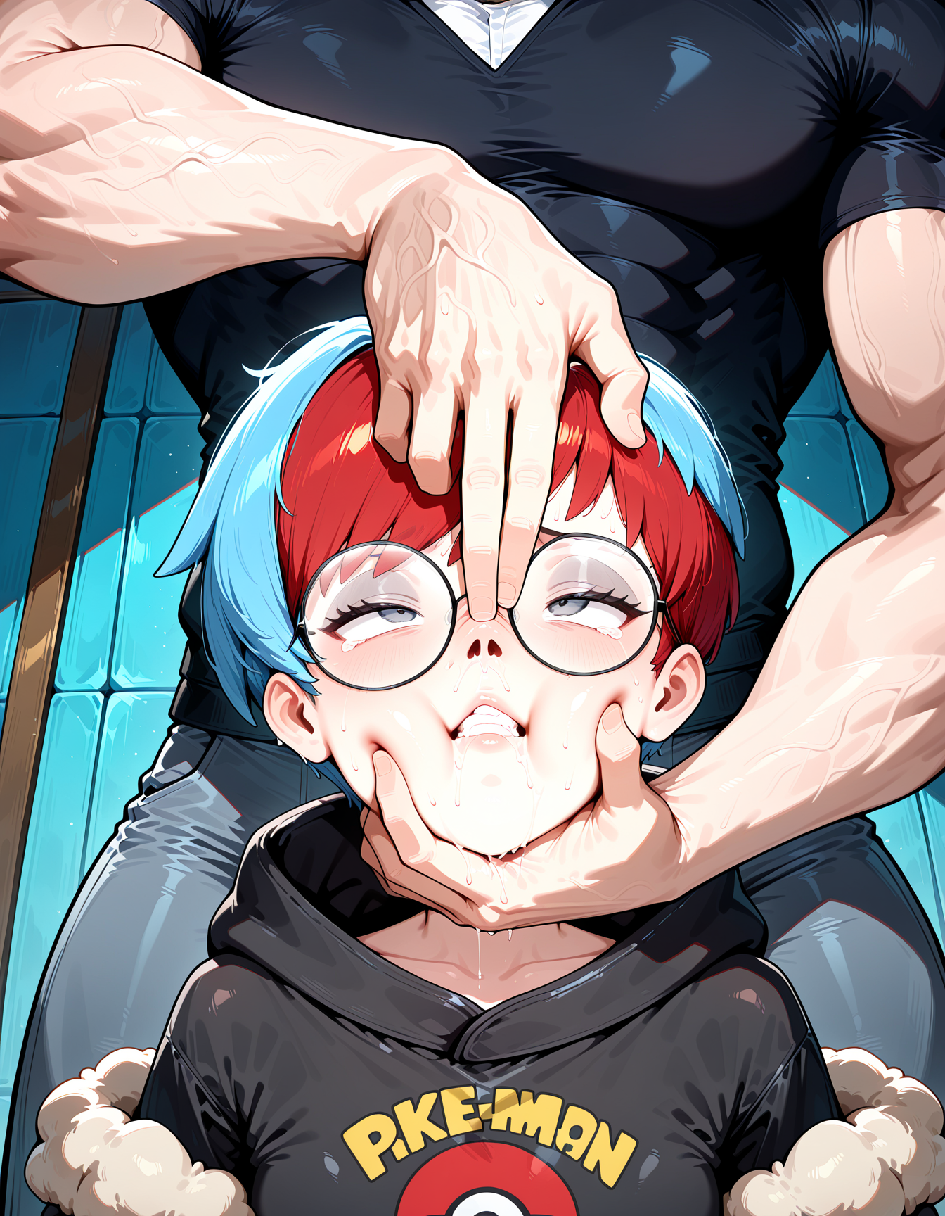 トリガーワード:forced p1g nose back, pushing nose up, finger on another's nose, covering forehead, nostrils, male head out of frame