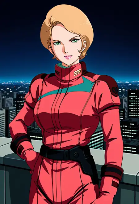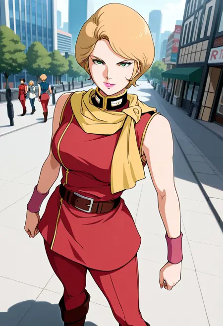 빨간색 군용 민소매 복, 노란색 스카프, 벨트, 빨간색 바지, 부츠