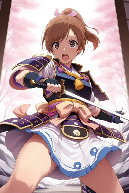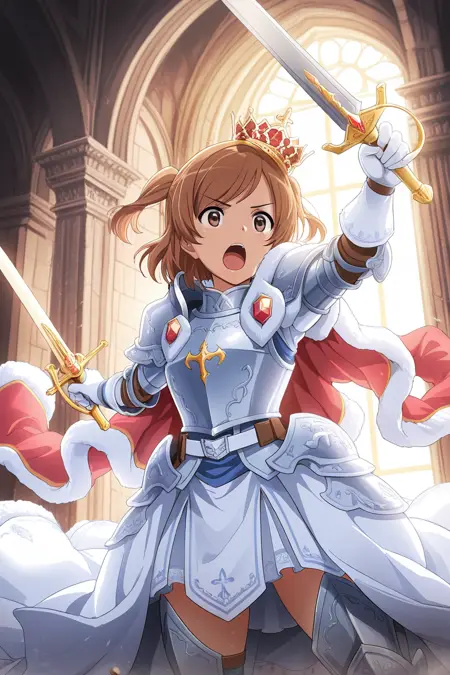 karen, 1girl, crown, mini crown, weapon, jacket, solo, skirt, brown hair, sword, yellow belt, holding weapon, brown eyes, jacket on shoulders, blue jacket, two side up, stage outfit
