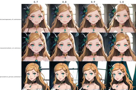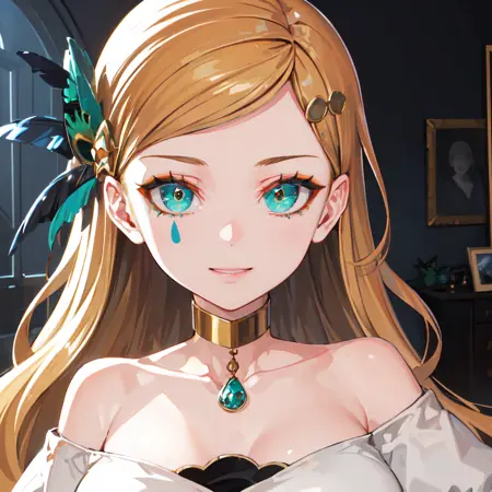 그녀의 옷차림을 위한 추천 프롬프트는 흰색 드레스, 초커, 금발, 긴 머리, 긴 소매, 청록색 눈입니다. 얼굴의 눈물은 구현하기 약간 복잡하므로, 얼굴 마크를 사용하고 가중치를 약 0.91.0으로 설정한 뒤 약간의 운이 필요합니다. 옷의 세부 사항을 더 잘 표현하되, anything을 망치지 않으려면 약 0.60.8의 가중치를 추천합니다. 전체 신체에 드레스를 표현하는 것은 매우 어렵지만, 상반신에는 훌륭하게 나옵니다.