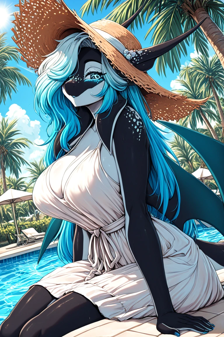 1girl, Penelope, anthro, furry, aquatic dragon, colored skin, blue skin, blue hair, white pupils, blue eyes, orca tail, horns, ears, fin wings, fins