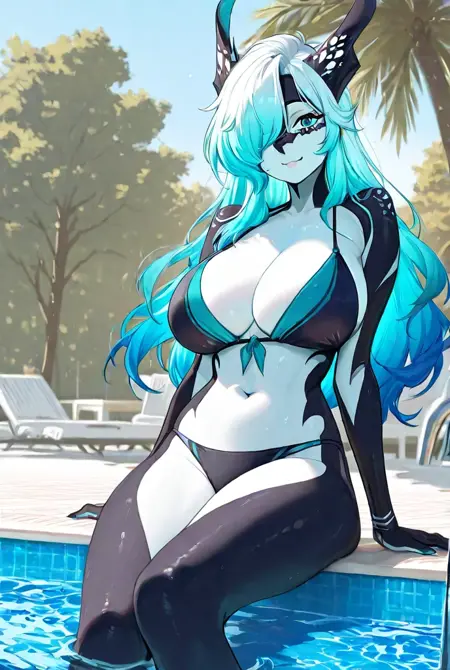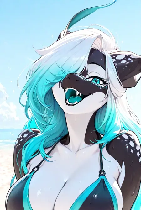 1girl, Penelope, anthro, furry, aquatic dragon, colored skin, blue skin, blue hair, white pupils, blue eyes, orca tail, horns, ears, fin wings, fins