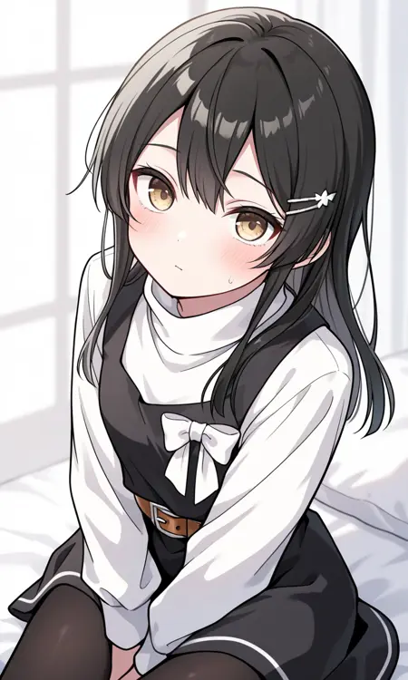 三越衣装: oyashiomtksKC、ロングヘア、シャツ、ロングスリーブ、白シャツ、髪クリップ、ベルト、黒ドレス、黒パンツホール、エプロンドレス、タートルネックシャツ、