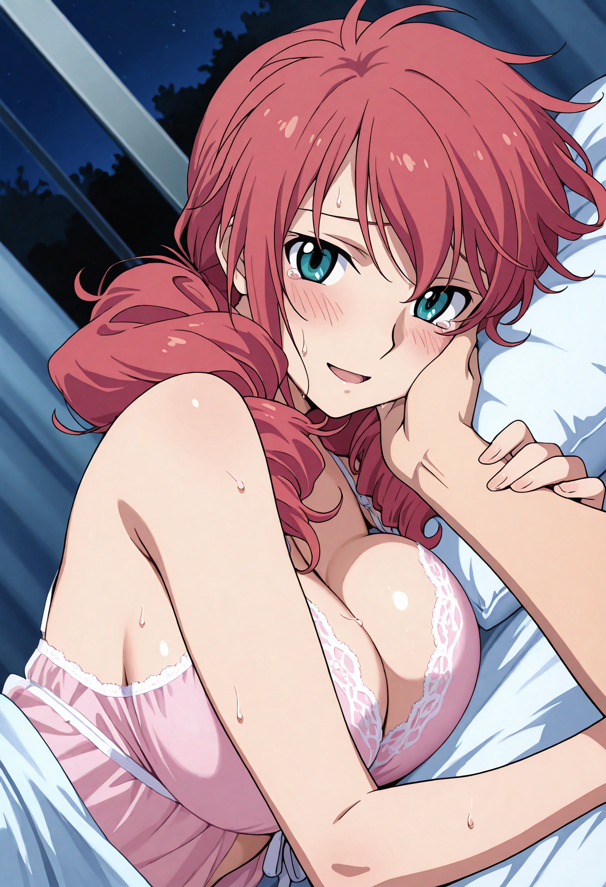feldtgrace, pink hair, green eyes, large breasts,