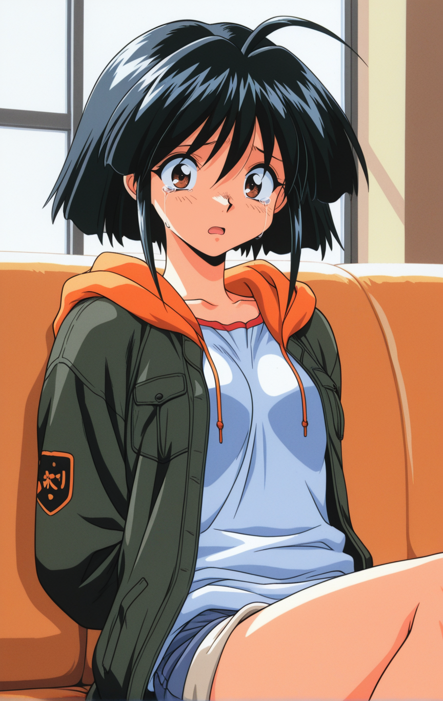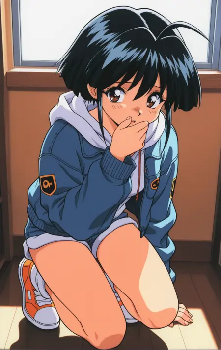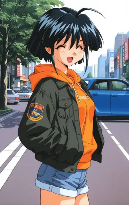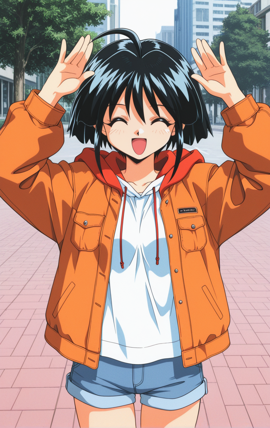 1girl,spdkozue, 1990s \(style\),solo,short hair,black hair,ahoge,sidelocks,brown eyes,small breasts,(medium breasts:0.8), jacket, hood,shorts,outdoors,city,smile,best quality,masterpiece,sensitive, lora:SpeedNanakuraKazueNoobAI2:1