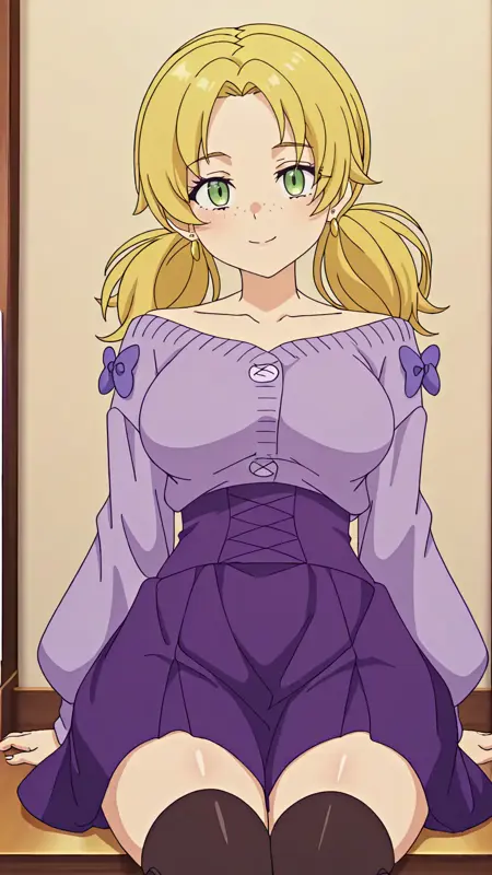 jamie-casual, 녹색 눈, 점, 금발, 낮은 더블테일, 귀걸이, 보라색 스웨터, 보라색 리본, 긴 소매, 어깨 노출, 보라색 치마, 허벅지 부츠