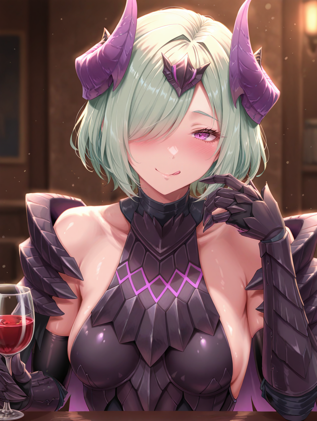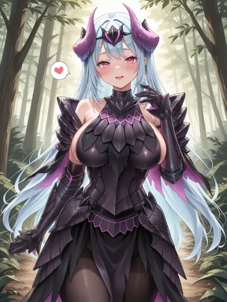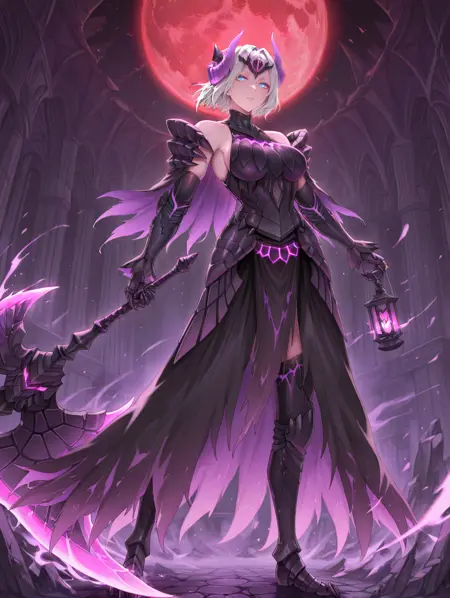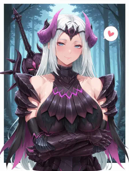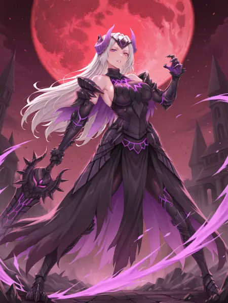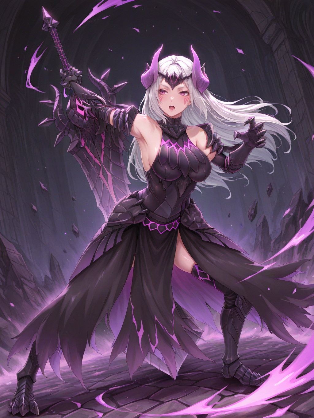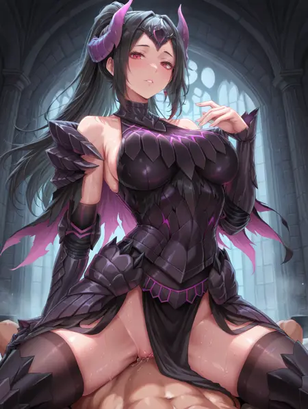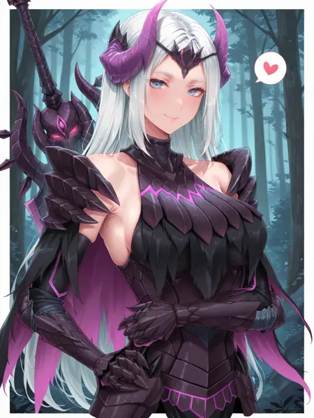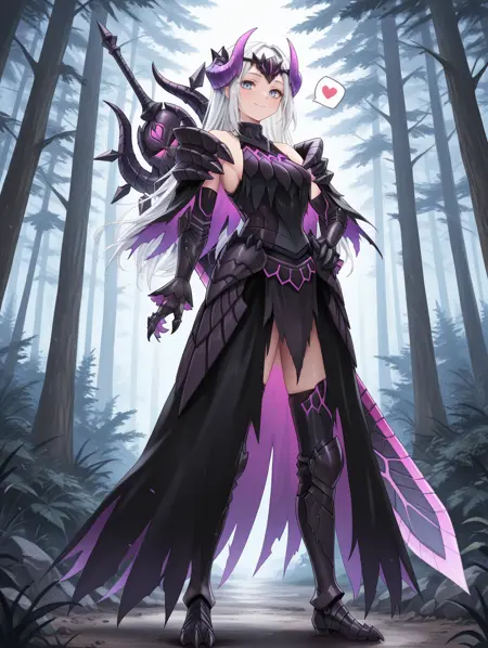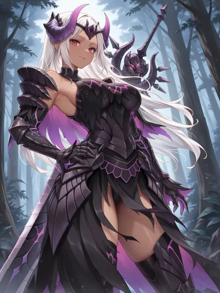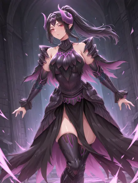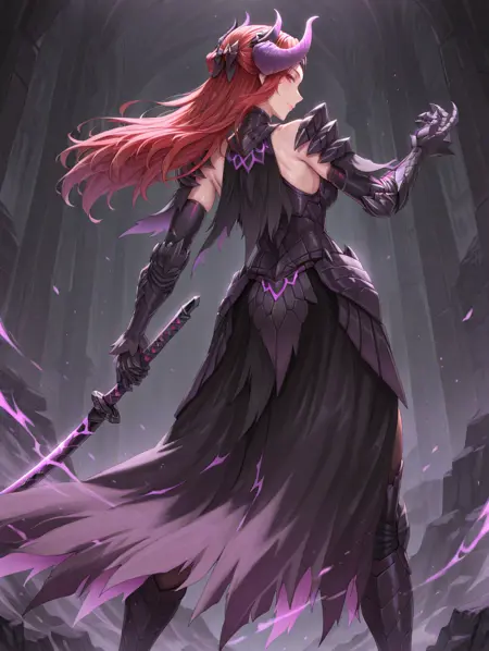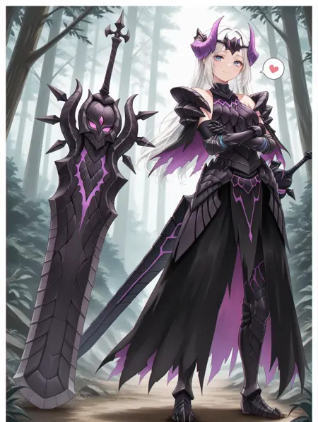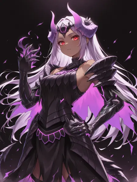 태그(의류): 고레 마갈라 갑옷, 보라색 뿔 장식, 검은 망토, 검은 가슴갑옷, 검은 갑옷 장갑, 검은 어깨갑옷, 검은 갑옷 드레스, 검은 허벅지 갑옷 부츠, 발톱