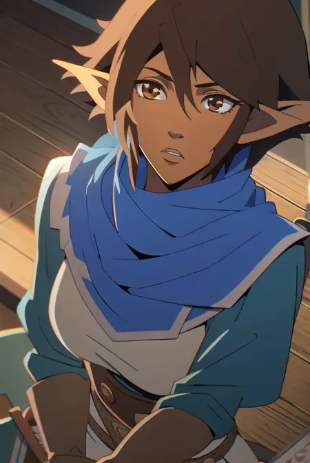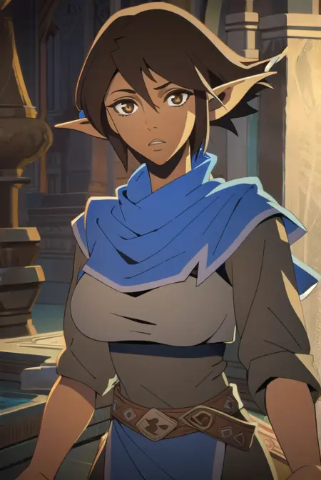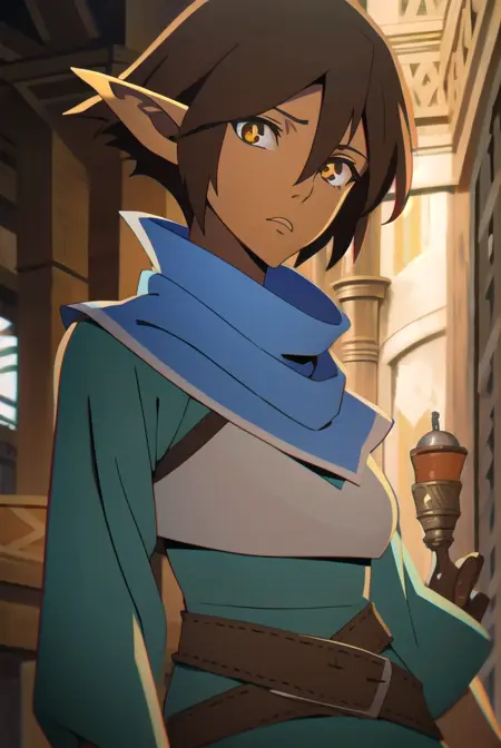 miriam, short hair, brown hair, pointy ears, elf, (brown eyes:1.4),