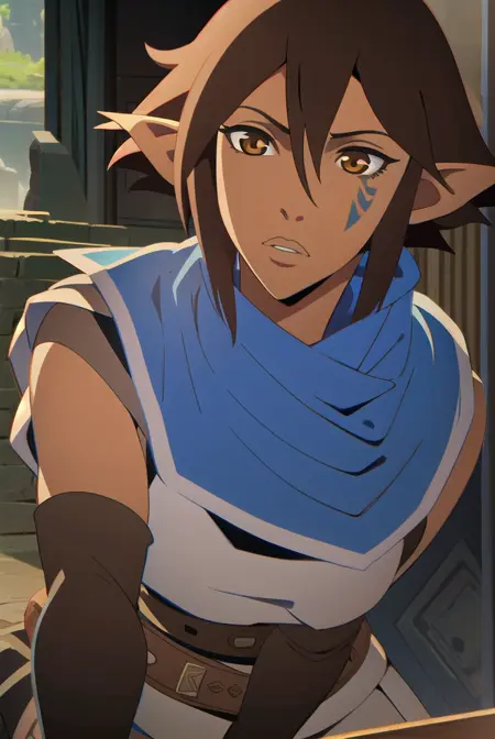 miriam, short hair, brown hair, pointy ears, elf, (brown eyes:1.4), facial mark,