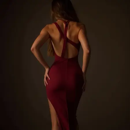 一位惊艳的女性身着简约的H1ghSL1T连衣裙,面料紧贴曲线,超长开叉露出一条美腿。挂脖领口深垂,展现迷人锁骨,褶皱腰身勾勒出沙漏型身材。面料在光线下闪烁,凸显其奢华质感。