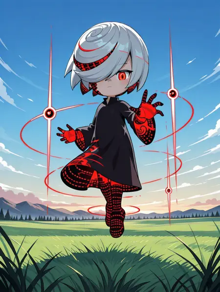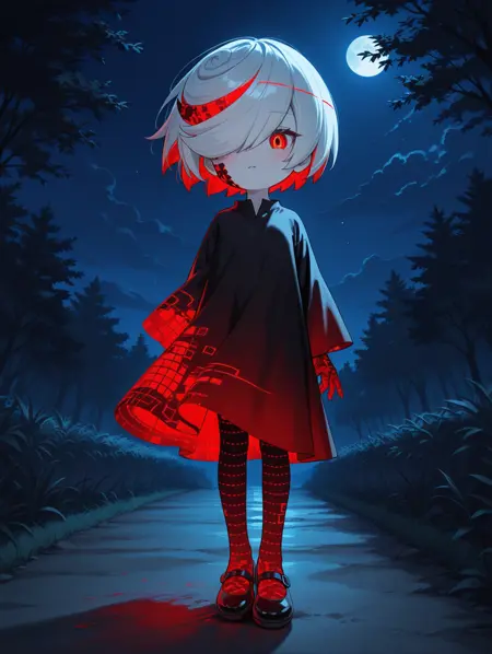 強化タグ:マリー・ジェーンズ、黒いドレス、片方の目を覆う髪