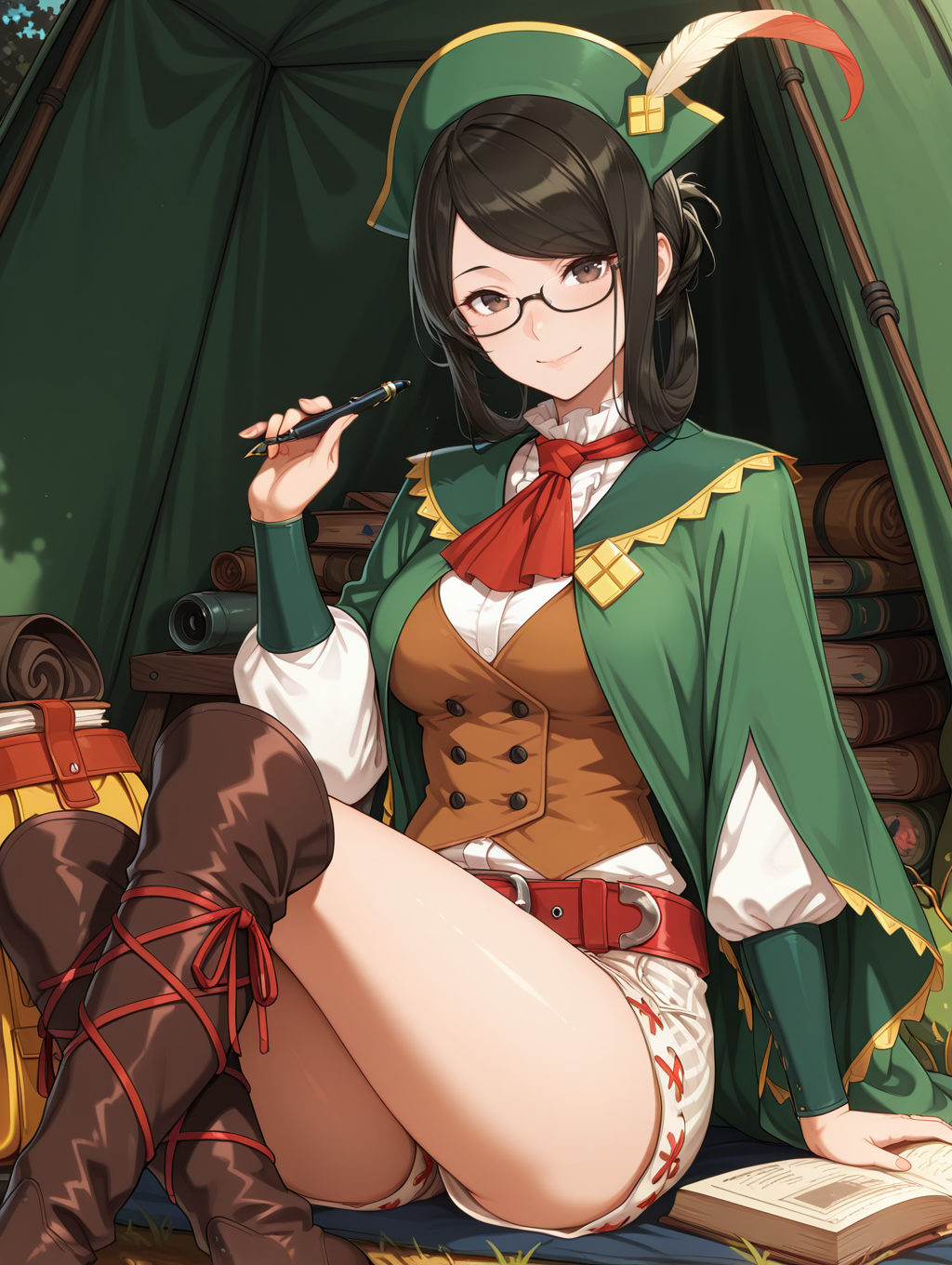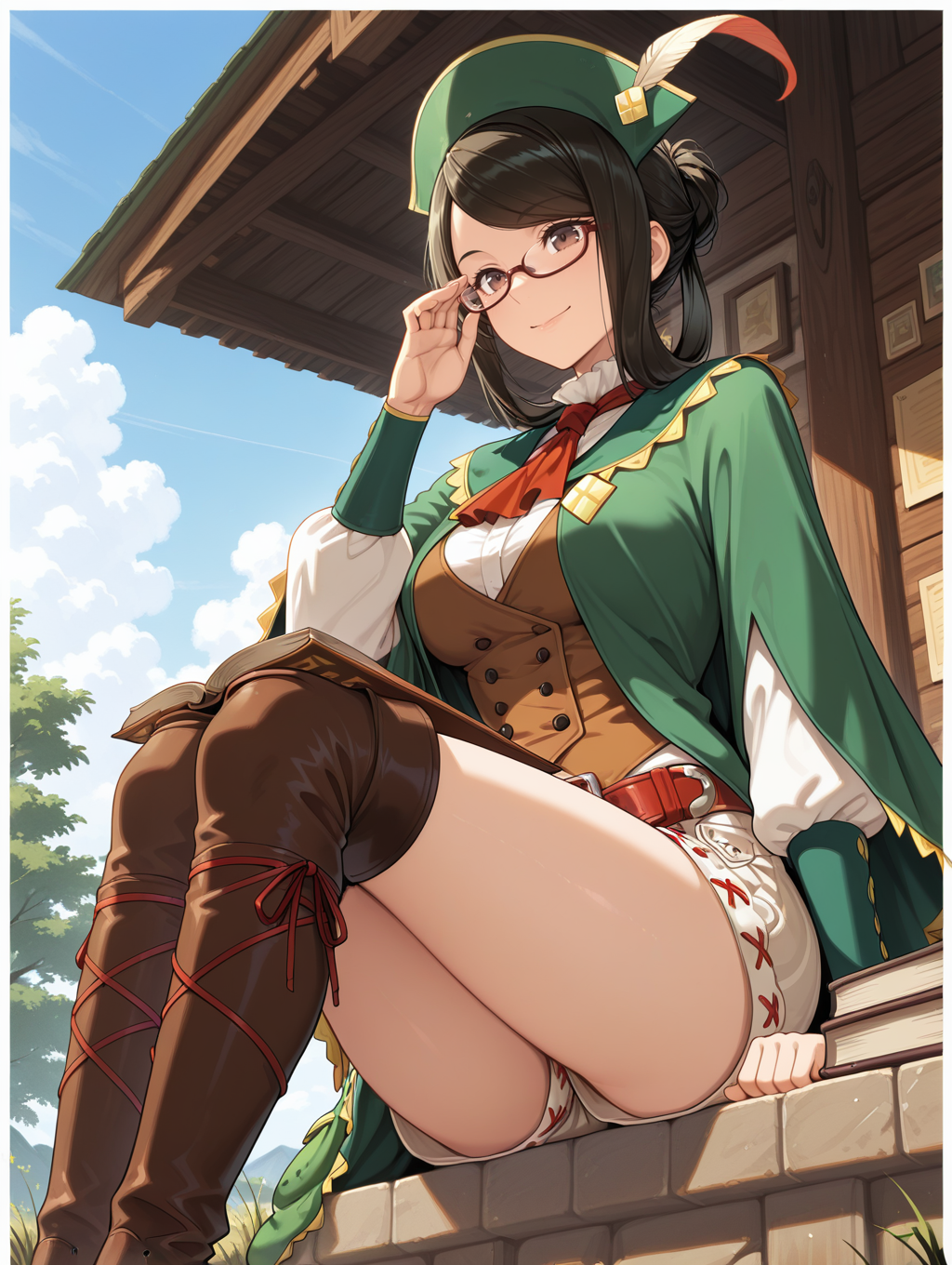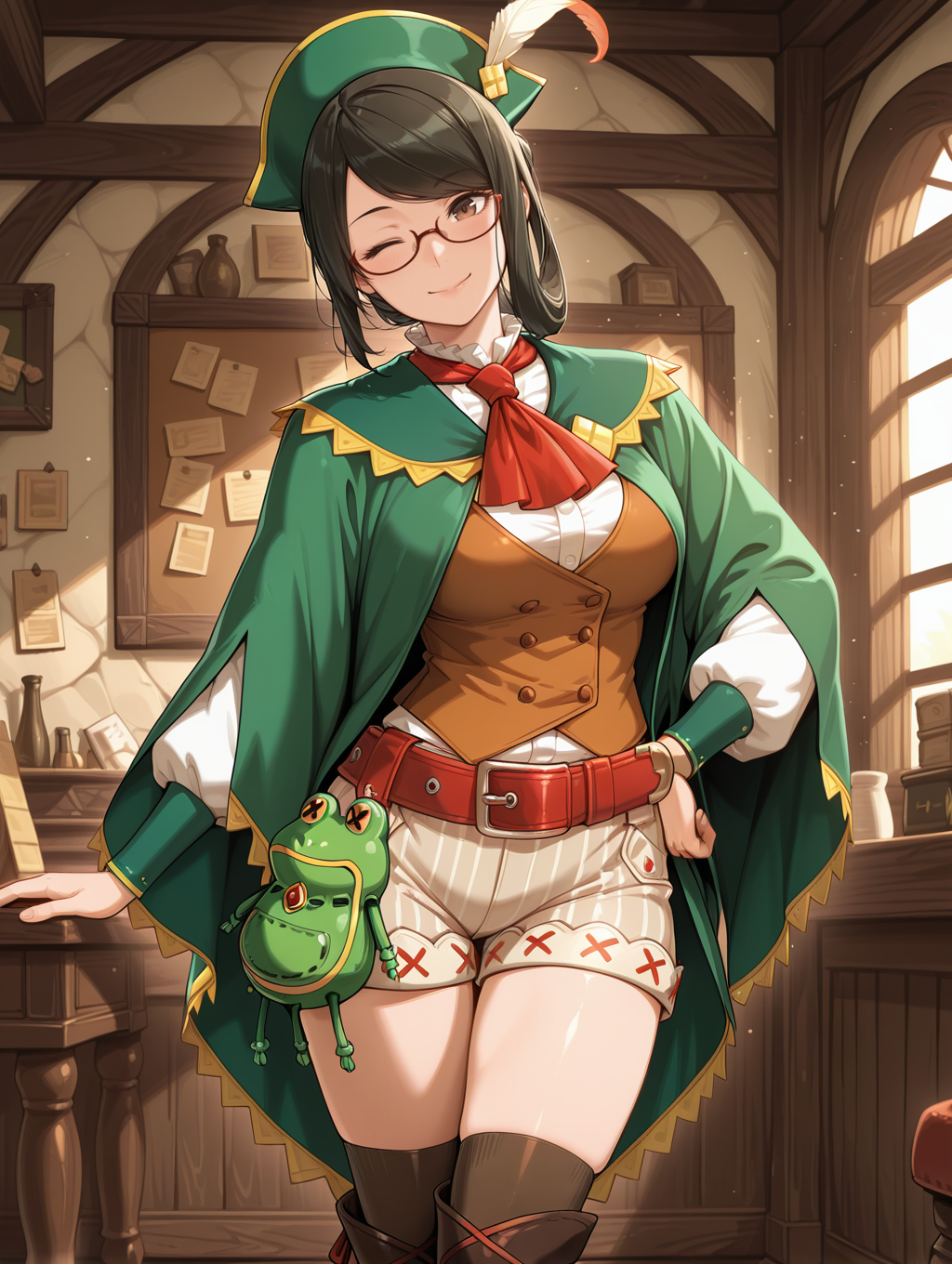 Tags (clothes): black under-rim eyewear, green headwear, green capelet, red ascot, white shirt, brown vest, red belt, white shorts, brown thighhighs, brown cross-laced boots, frog doll pouch