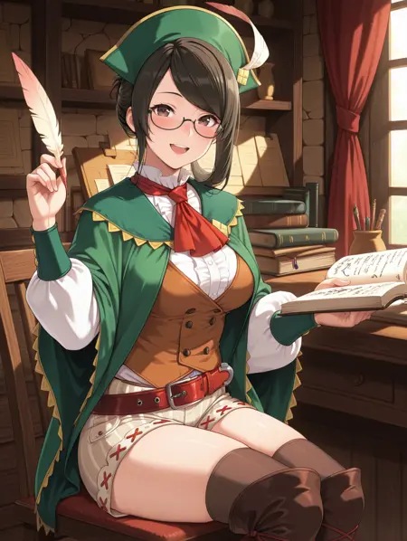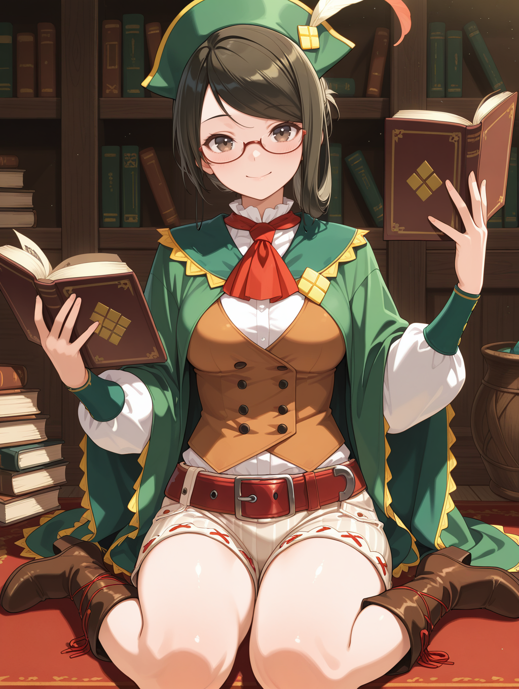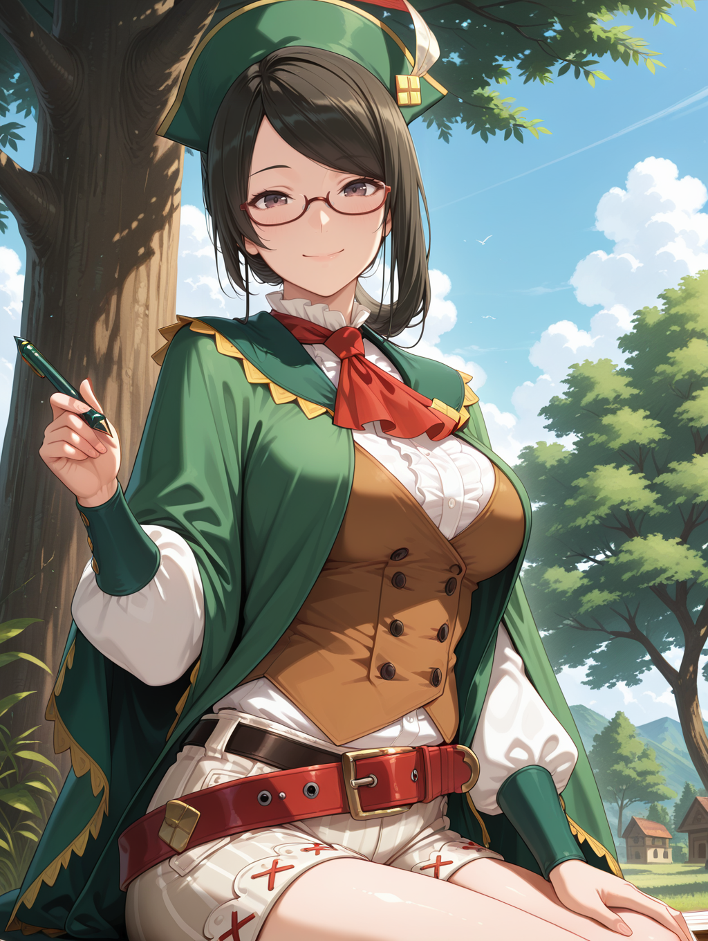 Tags (clothes): black under-rim eyewear, green headwear, green capelet, red ascot, white shirt, brown vest, red belt, white shorts, brown thighhighs, brown cross-laced boots, frog doll pouch