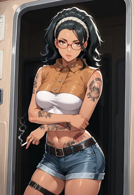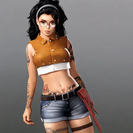 主服装——露脐上衣、无袖、露腹、牛仔短裤、腰带、腿带、靴子