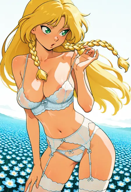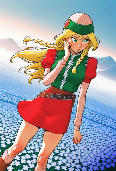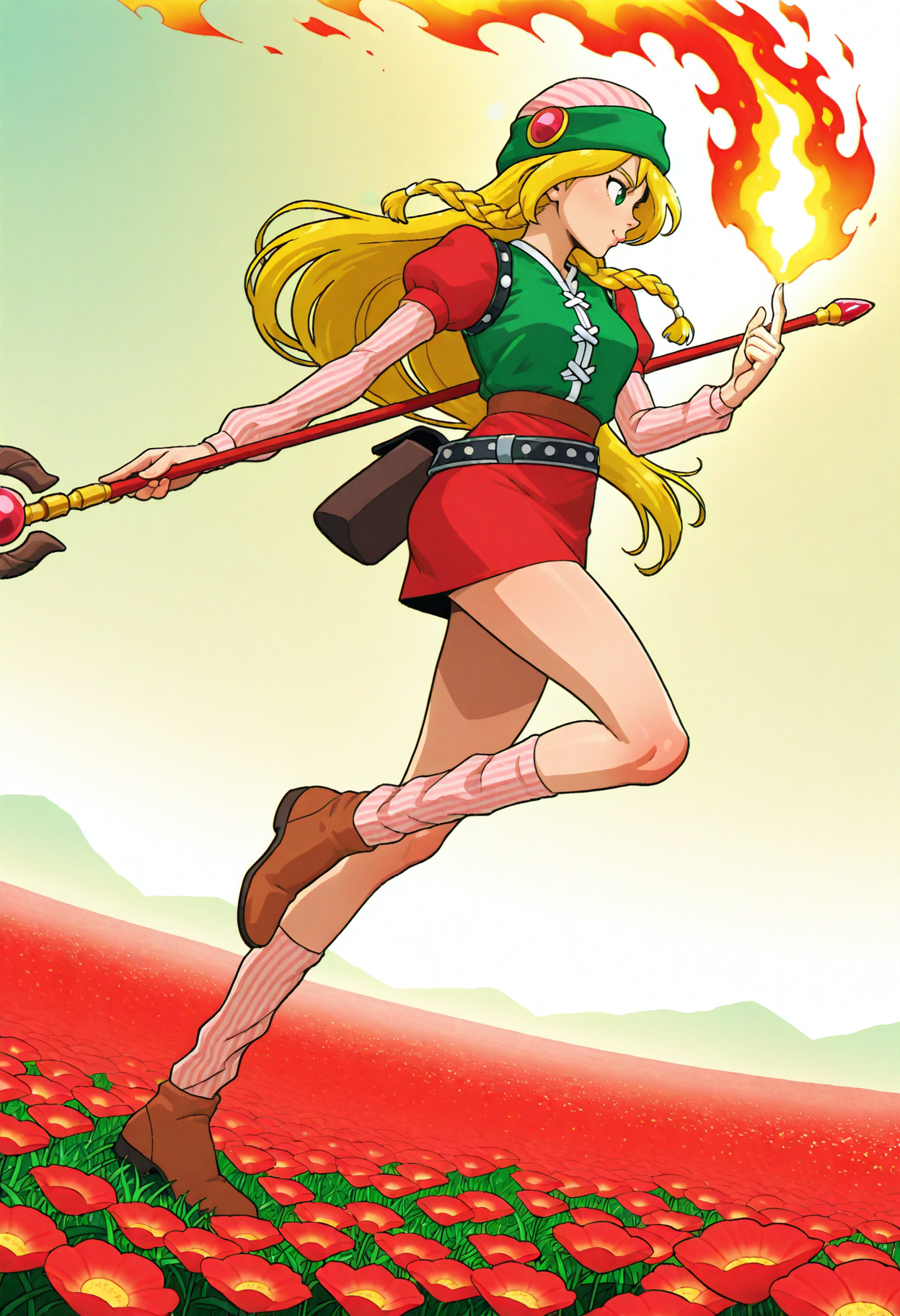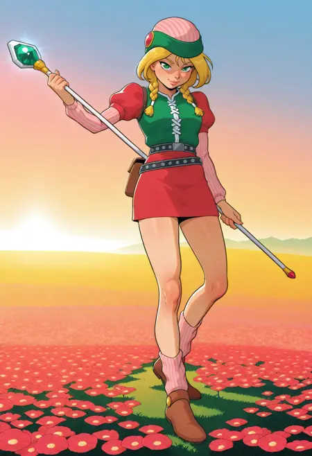 blonde hair, long hair, green eyes, twin braids, striped beanie, green tunic, puffy short sleeves, long layered sleeves, red skirt, miniskirt, belt, striped leg warmer, brown footwear,