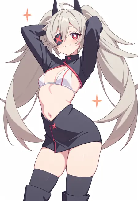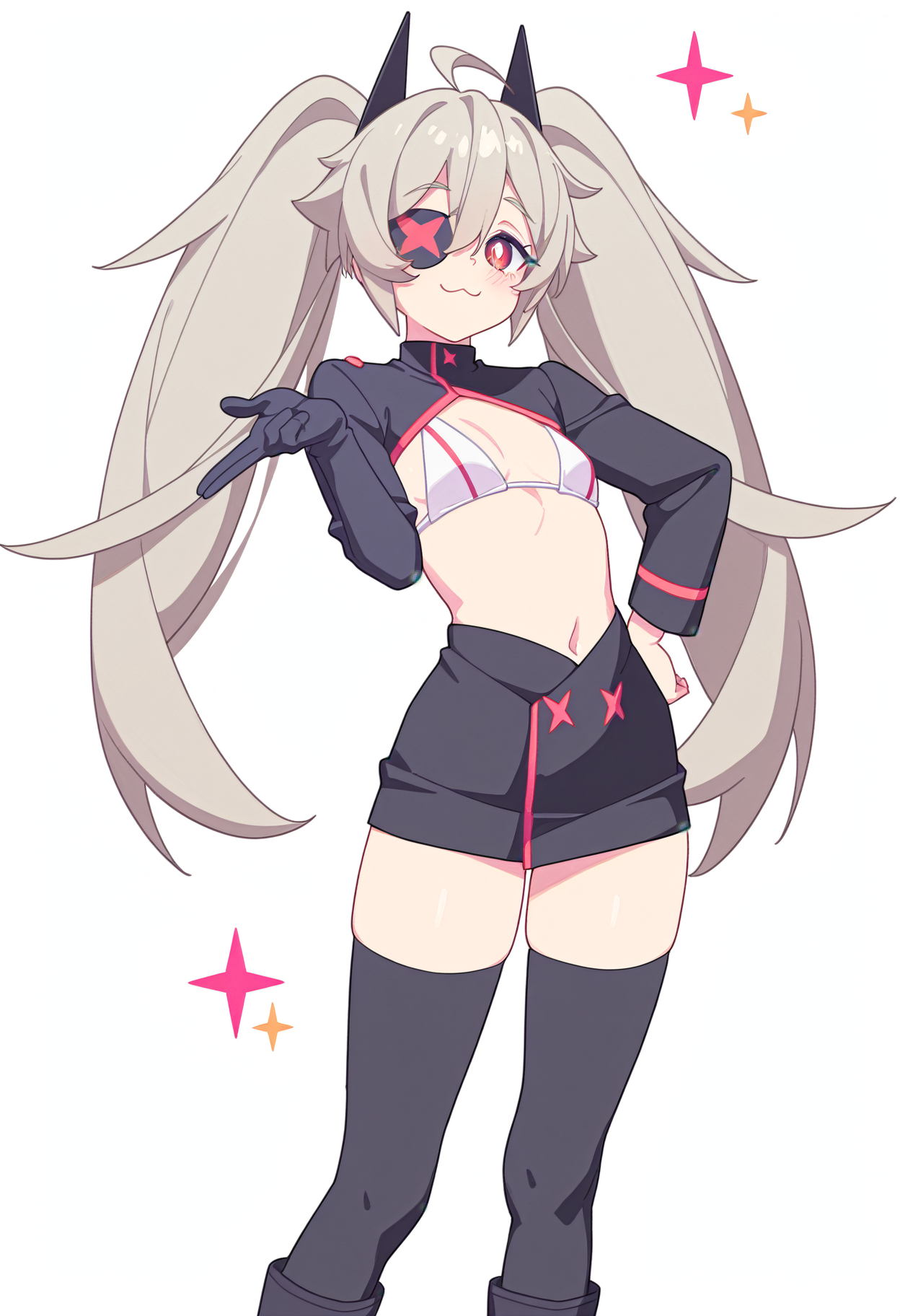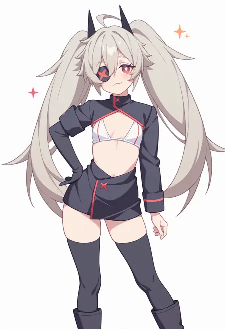 fail \(djmax\), grey hair, long hair, twintails, red eyes, mini skirt, eyepatch, single glove ,:3 ,thighhighs, boots, revealing clothes