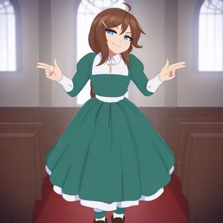 brown hair, blue eyes, messy hair, ponytail, braided ponytail, hairpin, ahoge, sidelocks, green dress, victorian, layered skirt, long skirt, sleeve cuffs, cross necklace,