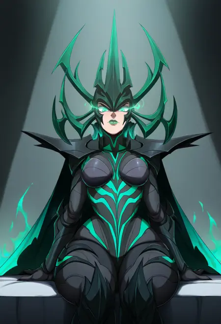 HelaIL,solo,1girl,bodysuit,armor,green eyes,glowing eyes,helmet,spiked helmet,cape,flaming cape,green cape,black bodysuit,green lips,claws,shoulder armor,green details