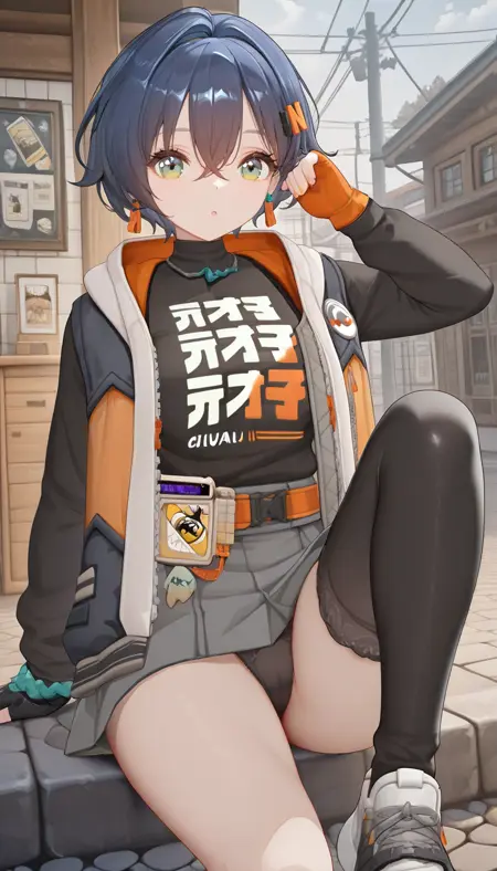 옷: 후드 자켓, 여는 자켓, 검은 셔츠, 옷에 쓰여진 문구, 긴 소매, 주황장갑, 오른손 장갑, 손가락 없는 장갑, 회색 스커트, 주황 벨트, 비대칭 다리 착용, 검은 허벅지양말, 한쪽 허벅지양말, 목걸이, 오른발 검은 허벅지양말, 왼발 양말,