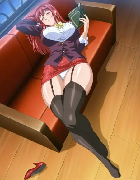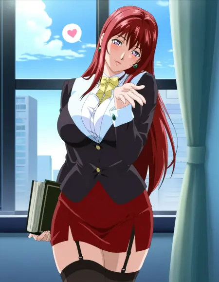 教师, 衬衫, 领结, 西装外套, 紧身裙, 红裙, 黑色过膝袜, 吊袜带, 高跟鞋