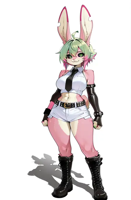 Lirin Sinclair(Character), furry, anthro, bunny, green hair, pink highlights, green eyes, black sclera, female,