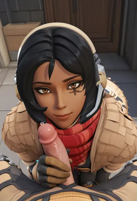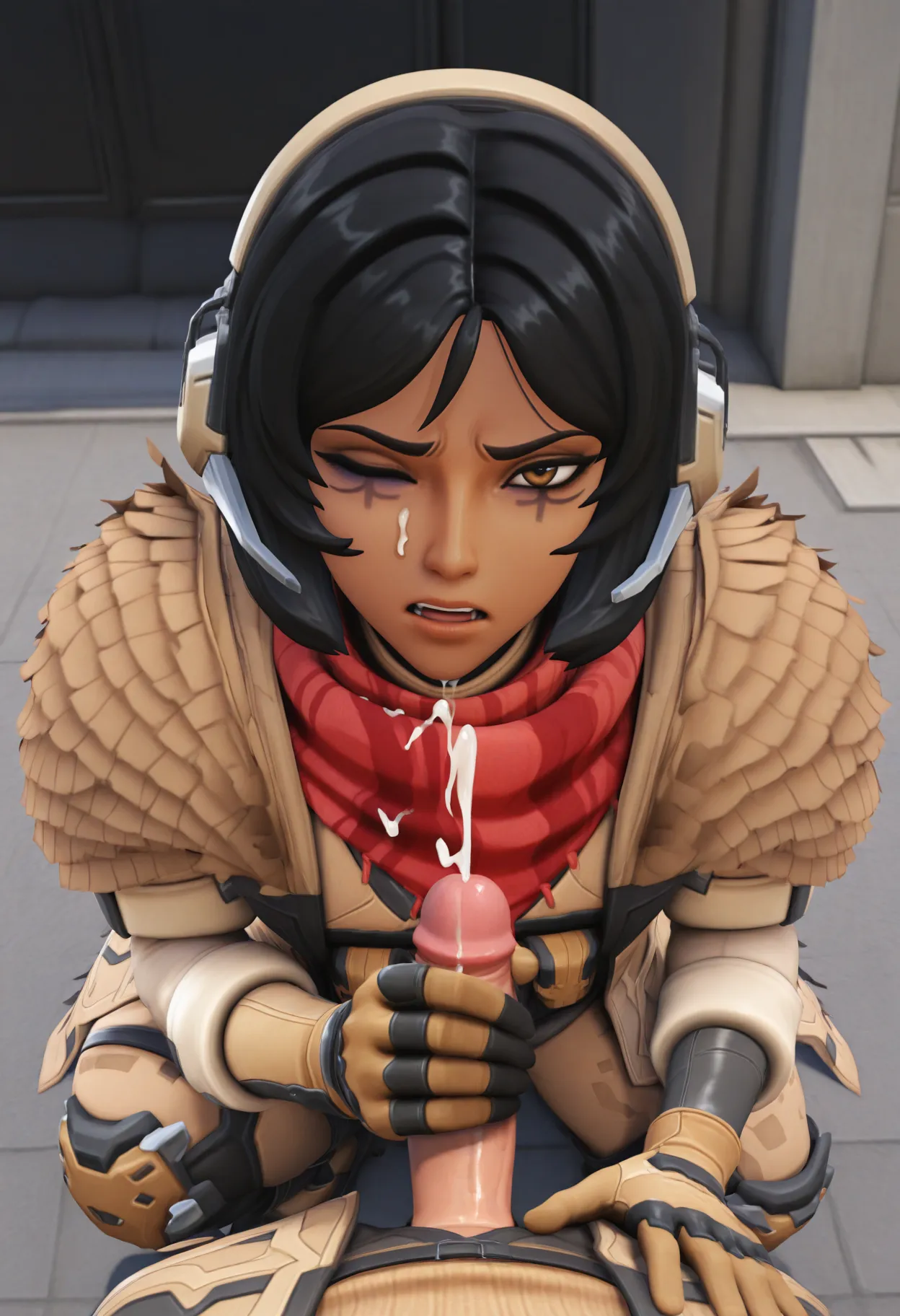要制作《守望先锋》3D风格,请使用 '3d' 标签。标签:sniperana, 棕色眼睛, 黑发, 短发, 深色皮肤女性, 面部标记, 一只眼睛下方的标记, sniperana costume, 红围巾, 头戴设备, 耳机