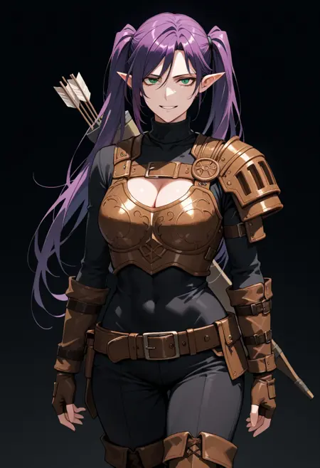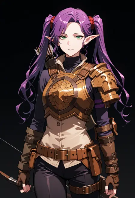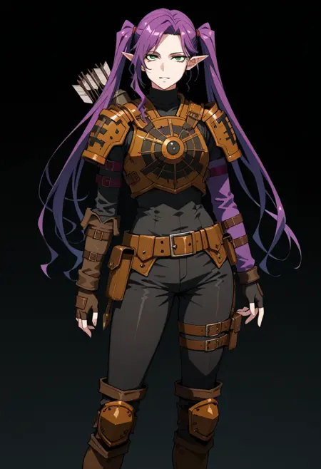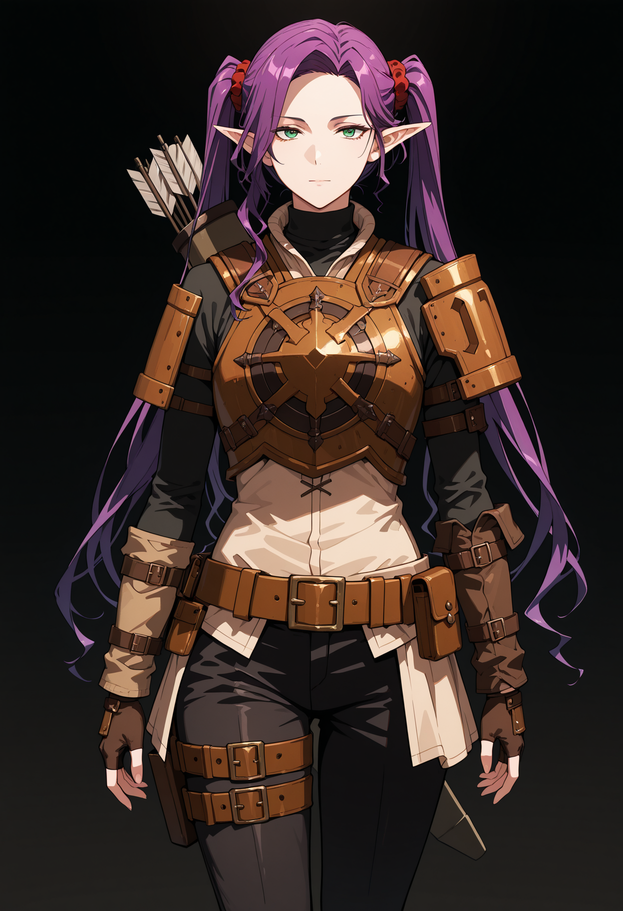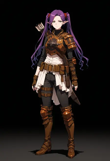 軽装甲、茶色のレザーアーマー、パウルドロン、円形の胸板、矢筒、黒色のタートルネック、腕用ベルト、指なしグローブ、赤いスクラブ、ベルト、ポーチ、黒色のパンツ、装甲付き膝当て、ブーツ、腰ベルト。