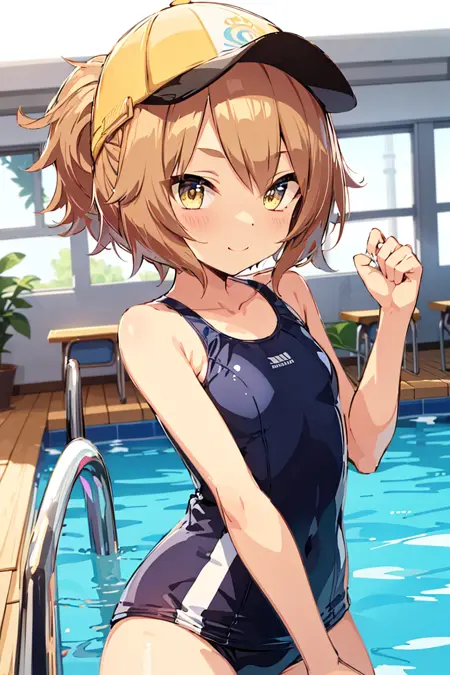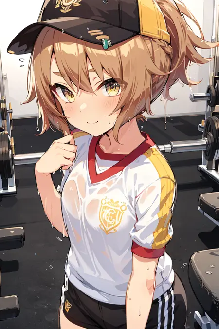 - 黄色い目、茶色の髪、短い髪、短いポニーテール、黄色い頭飾り