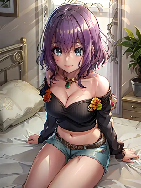 役に立つプロンプト: 灰色の目、花の髪飾り、デニムショートパンツ、胸元、ジーンズ