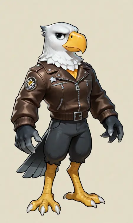 Apollo-AC, 秃鹰, 黑色皮肤带有灰色尖端, 白色头部, 黄色喙, 羽毛, 黑色眼睛, 爪子为白色, 黄色条纹鸟足, 黑色皮质轰炸机夹克