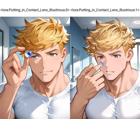 もう1つの修正されたコンセプトLoRAです。今回は、コンタクトレンズを装着する動作を安定化させました!Illustriousはこのコンセプトに関して十分な知識を持っていないようで、何となく通るような画像は生成しますが、常に目に入れたくないような奇妙な装置のように見えてしまいます。