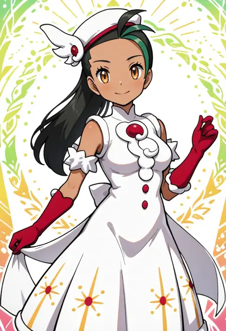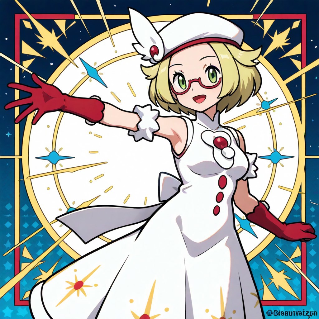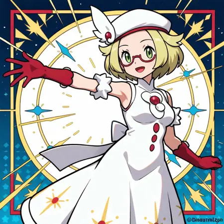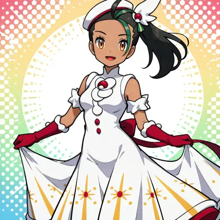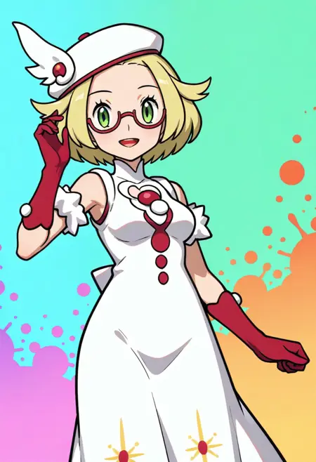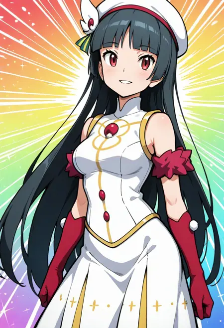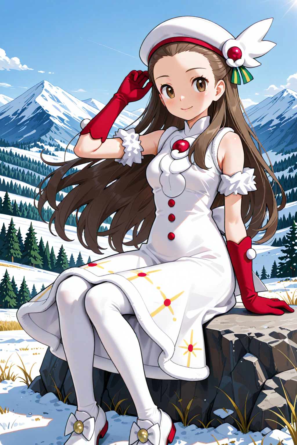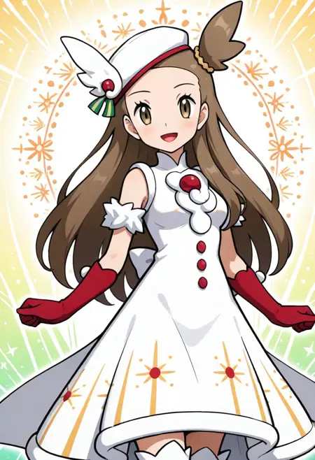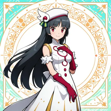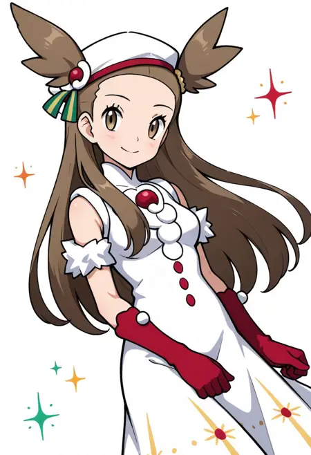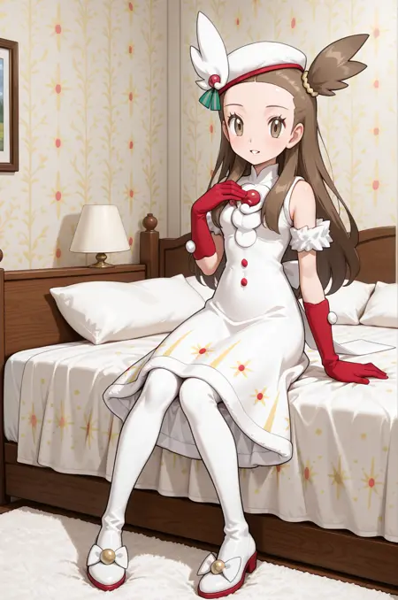 머리 장식, 모자, 흰색 머리장식, 어깨노출 드레스, 흰색 드레스, 긴 드레스, 단추, 모피 팔찌, 빨간 장갑, 뽀뽀봉(옷), 허벅지 부츠, 신발 리본, 흰색 신발